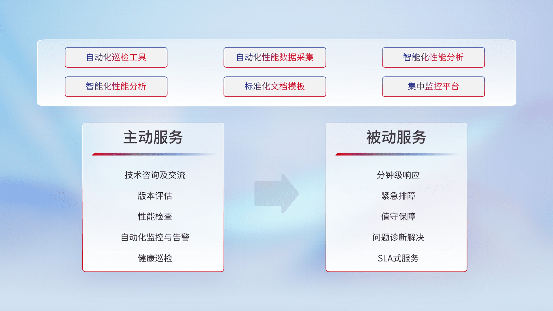智能化工具和标准化文档,,,保障服务质量,,,,提供主动服务(包含技术咨询、、、版本评估、、、性能检查、、自动化监控与告警、、、、健康巡检)和被动服务包含(分钟级响应、、紧急排障、、、、值守保障、、问题诊断解决、、SLA服务)。。。。